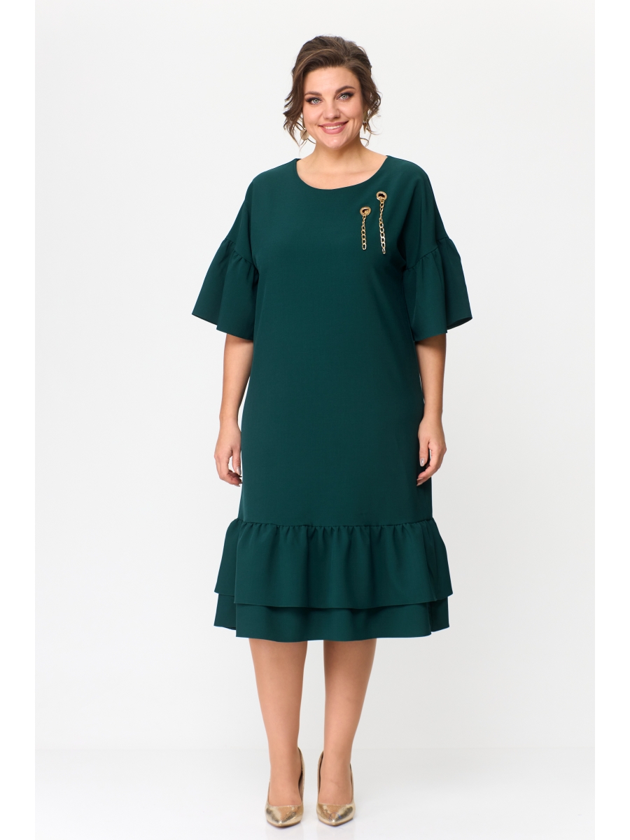 Платье свободного кроя. Линия плеча спущенная, без вытачек. Горловина полукруглая, рукав 3/4. По нижней линии рукава волан, низ изделия заканчивается двумя воланами. Длина изделия ниже колена. Визитной карточкой данной модели является украшение из комбинации двух люверсов и цепочки . Цепочка съемная, платье просто с люверсами так же хорошо смотрится.