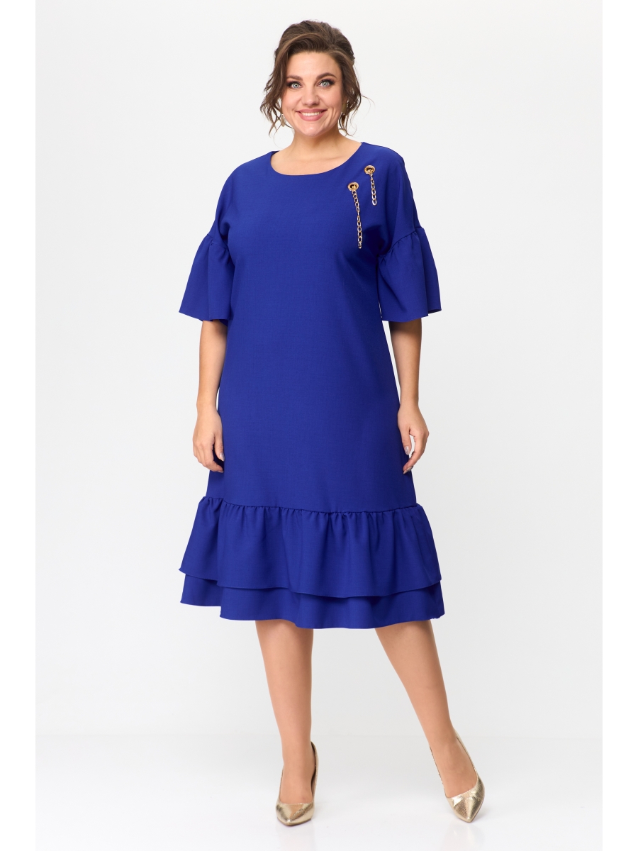 Платье свободного кроя. Линия плеча спущенная, без вытачек. Горловина полукруглая, рукав 3/4. По нижней линии рукава волан, низ изделия заканчивается двумя воланами. Длина изделия ниже колена. Визитной карточкой данной модели является украшение из комбинации двух люверсов и цепочки . Цепочка съемная, платье просто с люверсами так же хорошо смотрится.