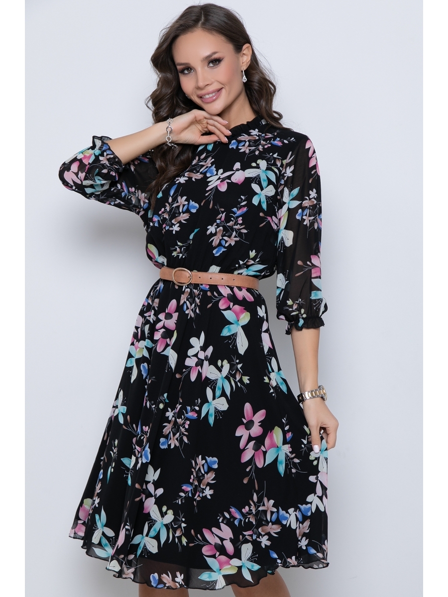 Восхищайте и удивляйте! Элегантное шифоновое платье, подчеркивающее женственность - отличное решение на каждый день или на праздник для современной стильной женщины. Шикарная модель с объемными рукавами выполнена из высококачественного шифона с авторским цветочным принтом. Очаровательное свободное платье с юбкой полу-солнце создаст нежный воздушный образ! Круглая горловина оформлена рюшей с застежкой на пуговицу на спине. Платье имеет идеальную посадку благодаря индивидуальной корректировки длины за счет мягкой комфортной резинки на талии. По переду сделаны вытачки на грудь. Платье отрезное по талии. Рукава втачные, 3/4, снизу подогнуты и сосборены на резинку. Платье с подкладом, притачным по горловине и пройме. Без ремня, ремень как пример образа.