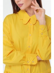 Расширенный крой, слегка заниженная талия, подчёркнута кулиской с завязывающимся поясом, втачные длинные рукава с фигурными манжетами и возможностью регулировать длину. Нижняя часть с двумя присборенными воланами. Фигурный воротник рубашечного кроя, застёжка на пуговицы до уровня талии.