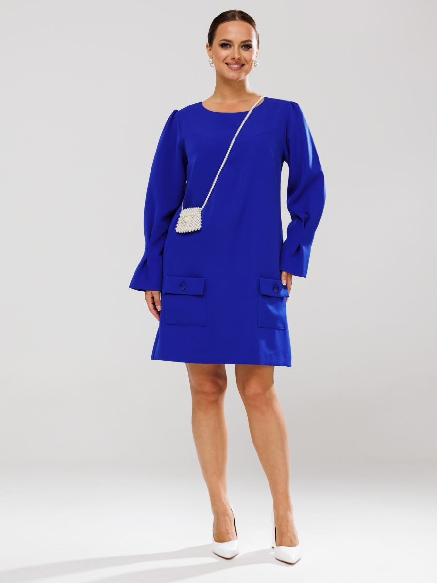 Платье А-силуэта из плательного полотна (немного тянется), без подкладки. Перед с нагрудными вытачками и накладными карманами. Спинка со средним швом и застежкой на навесную петлю-пуговицу. Рукава втачные, одношовные со сборкой по окату и двумя защипами по низу.