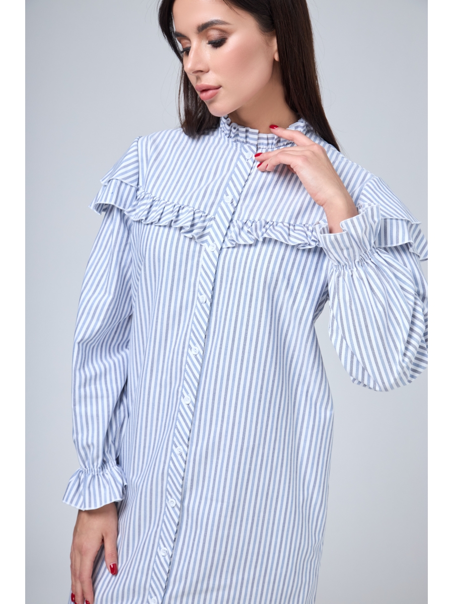 Рукава втачные с каскадными воланами в верхней части, длинные, собраны на резинку на запястье. Горловина выполнена в виде стойки-рюша. Застежка - притачная планка с петлями и пуговицами. Спинка удлинена относительно переда В модели интересно использовано направление полоски, пропорционально вытягивает фигуру.
