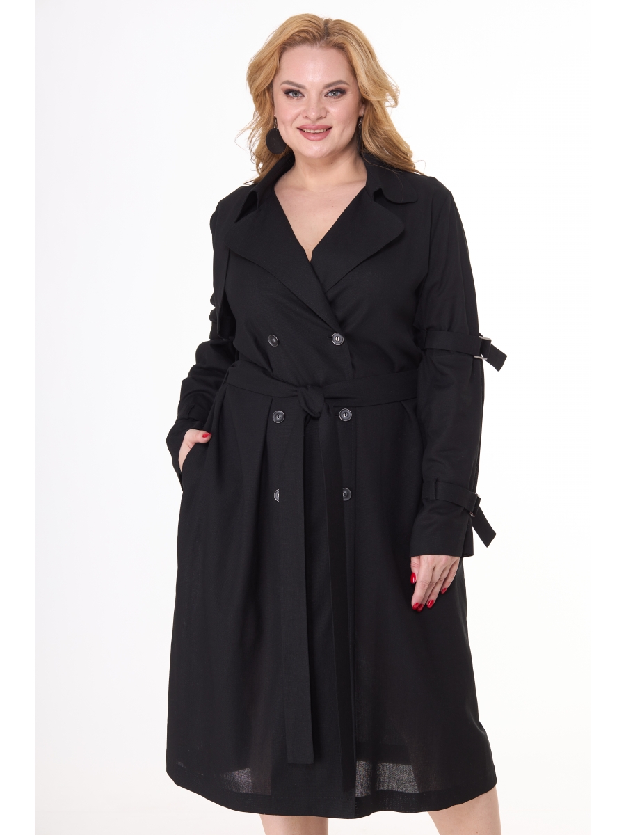 Прямой свободный силуэт со всеми деталями классическоготренча: отлетные кокетки по переду и спинки, с карманами, патами на свободных втачных рукавах, отложным воротником на стойке и лацканами, двубортной застёжкой на пуговицы и завязывающимся поясом.