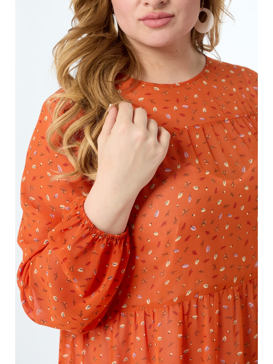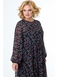 Кокетки по переду и спинке платья, втачной свободный рукав на резинке по низу. Застежка на навесную петлю и пуговицу по спинке вверху. От слегка завышенной линии талии два волана.