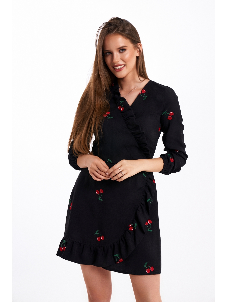 Платье женское умеренного объема, приталенного силуэта, с запахом по переду. Отрезное по линии талии. V-образный вырез горловины. Перед и спинка с 2-мя талиевыми вытачками. Юбка слегка расклешена книзу. По правой стороне горловины и по низу юбки расположены фигурные воланы.