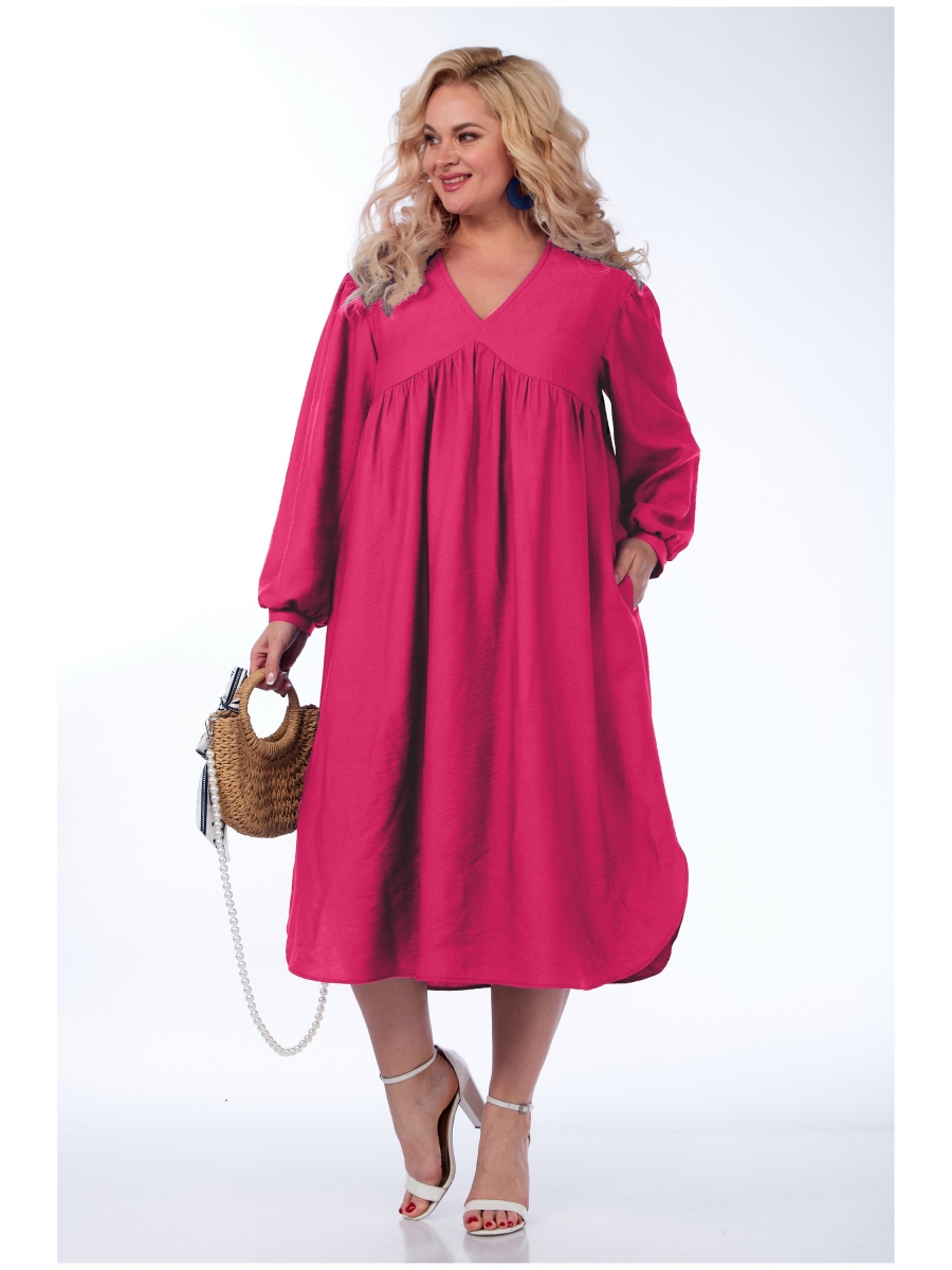 Платье женское, силуэт «трапеция». Длина миди. По низу платья выполнена фигурная отрезная кокетка. Нижний срез кокетки оформлен сборкой. По спинке встречная складка, выходящая из прямой кокетки. Вырез горловины V-образный. Рукав длинный, по оканту рукава и нижнему срезу сборка, низ на притачной манжете. Низ платья фигурный с разрезами по боковым швам.