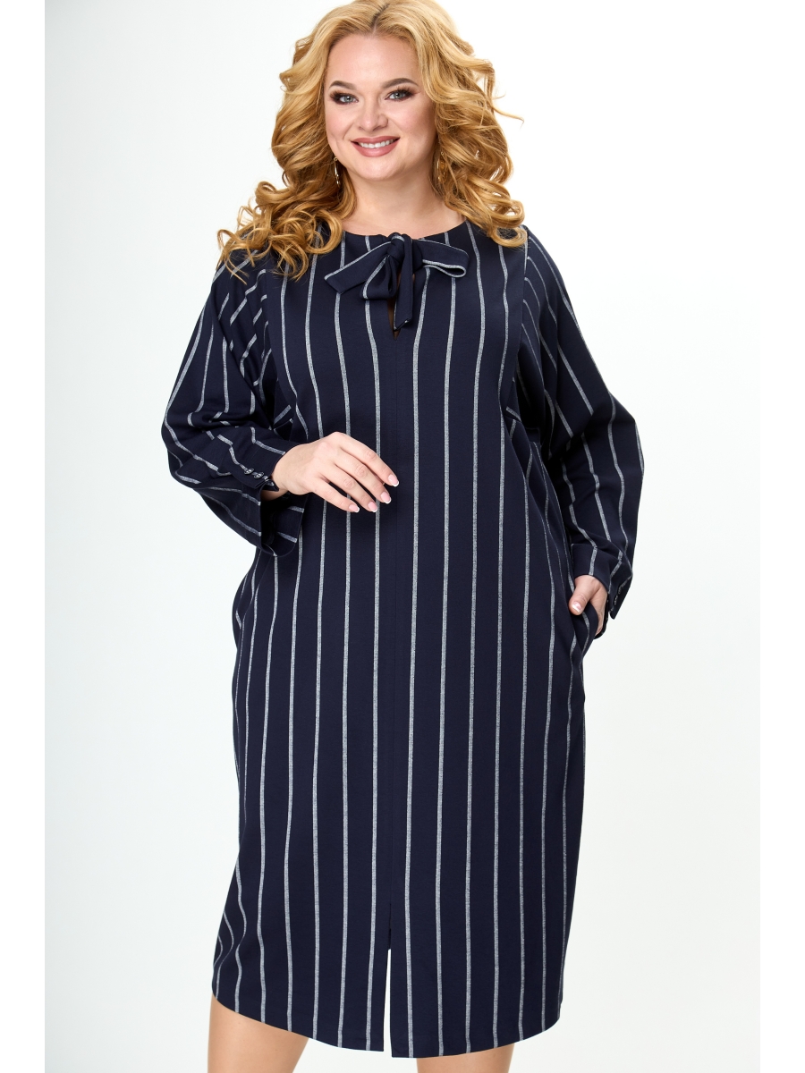 Прямой силуэт, заниженная квадратная линия проймы-особенность модели платья. В среднем шве переда разрезы- от линии округлой горловины и от линии низа. Рукав длинный, расширенный со складкой и пуговицами по низу. В боковых швах функциональные карманы. Дополняет образ завязывающиеся детали вверху.