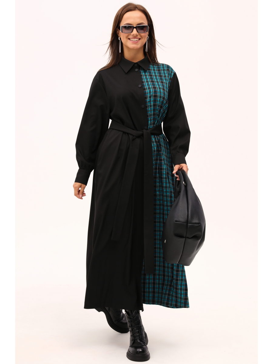 Платье А-силуэта длиной макси. Воротник рубашечного типа - отложной на отрезной стойке. По переду расположена центральная застежка на кнопки. Спинка со средним швом. В боковых швах обработаны функциональные карманы. Рукав втачной прямой длинный, со спущенной линией плеча, по низу на манжете с застежкой на кнопки.