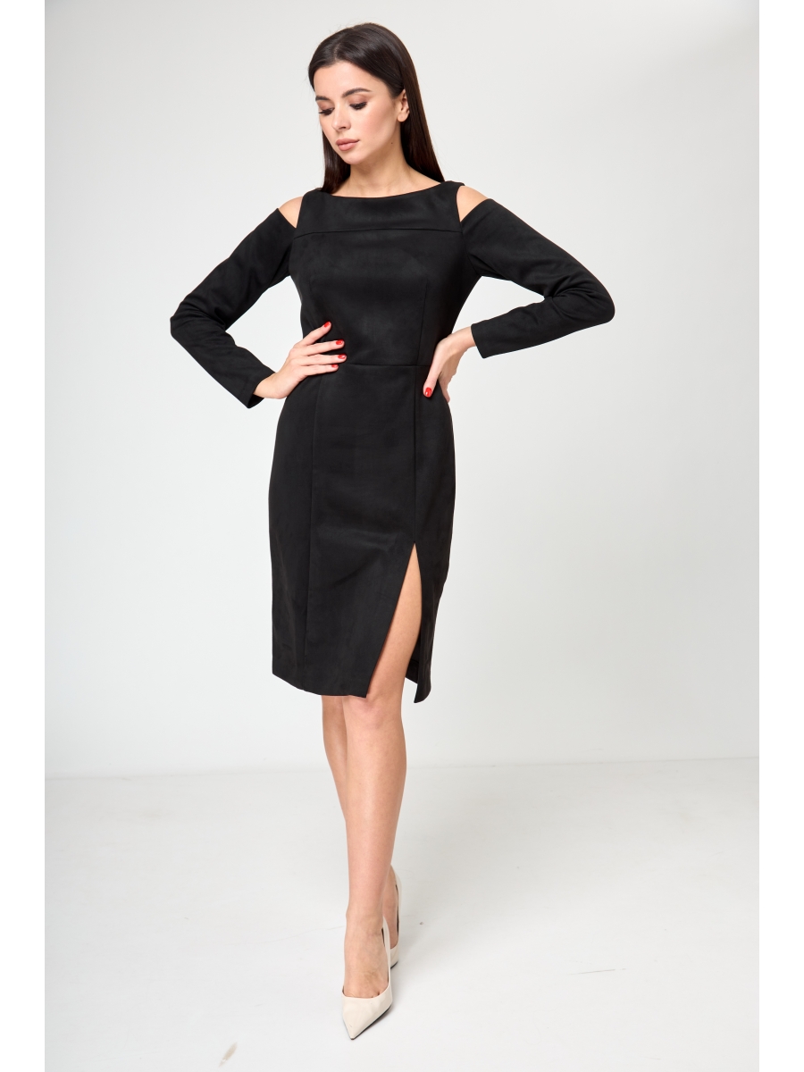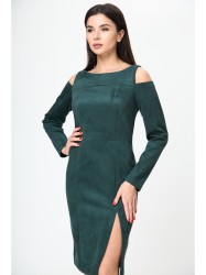 Платье из эластичного полотна с замшевым покрытием. Полуприлегающий силуэт с открытой линией плеча. Отрезное по линии талии. Элегантный вырез горловины лодочкой. Кокетки по переду и спинке. Конструктивные линии талевых и нагрудных вытачек, рельефов. В левом рельефе нижней части платья разрез. Выполнено в чёрном и зелёном оттенках. Длинный рукав.