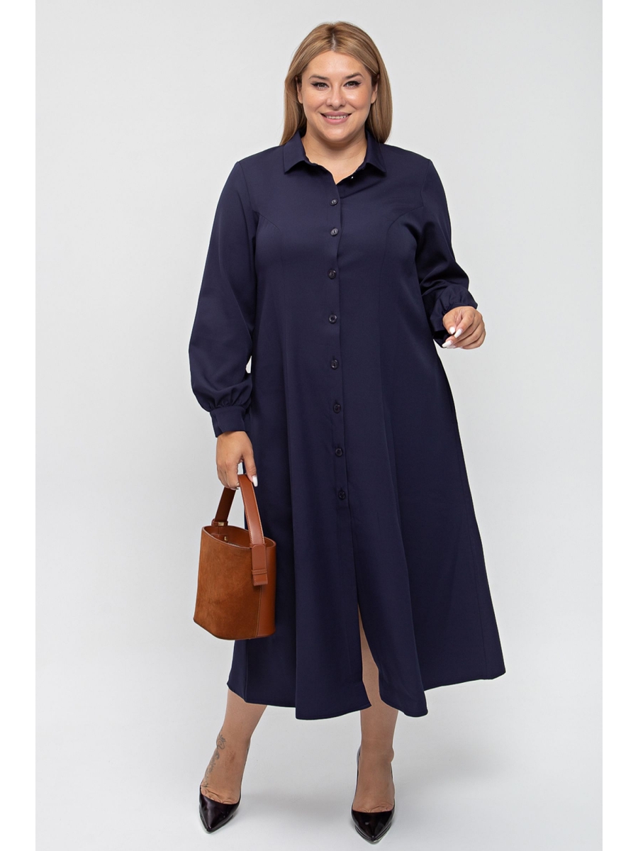 Платье свободного силуэта из костюмно-плательной ткани. По спинке и переду вертикальные рельефы. Горловина оформлена отложным воротником на притачной стойке. По переду планка по всей длине изделия, с застежкой на петли и пуговицы.  Втачной рукав по низу  присобран на манжету. Низ прямой. В боковых швах удобные карманы.