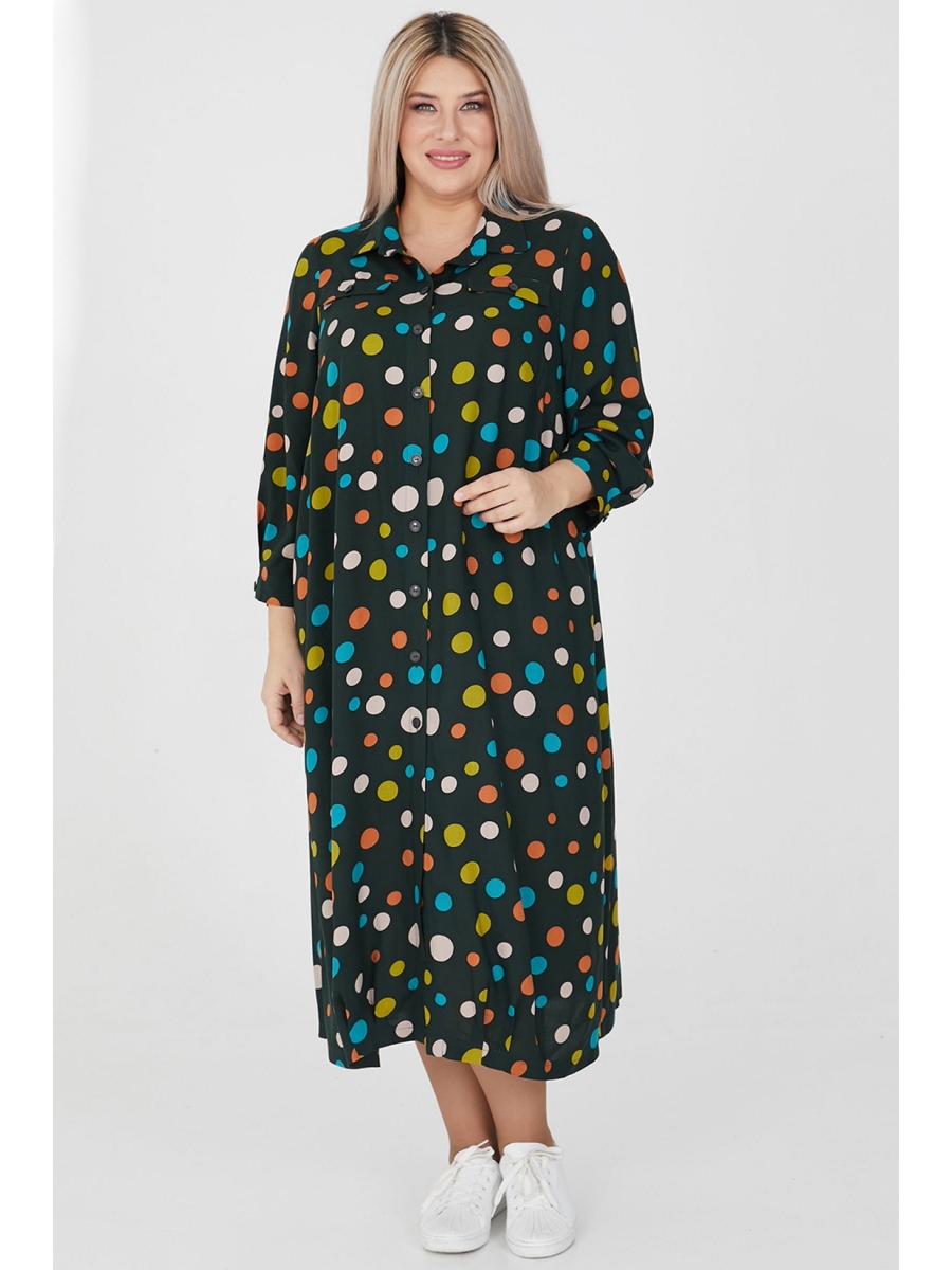 Платье прямого силуэта из штапельной ткани в «яркий горох». Прилегание по груди за счет вытачек. По линии груди декоративные элементы в виде клапанов с пуговицей. Горловина оформлена отложным воротником на притачной стойке. По переду планка по всей длине изделия, с застежкой на петли и пуговицы. Втачной рукав длиной 7\8 по низу оформлен двумя складками, придающими небольшой объем. В боковых швах удобные карманы. Низ прямой. Стильный, удобный вариант для летних прогулок.