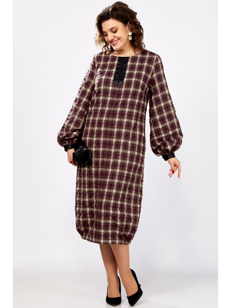 Платье свободного силуэта из жатой плательной ткани в клетку. Горловина округлой формы. Перед платья с нагрудными вытачками и декоративной планкой из эко кожи с пуговицами. Спинка с застежкой на молнию в среднем шве. В боковых швах глубокие функциональные карманы. Рукав втачной длинный, по низу декоративная манжета из эко кожи с застежкой на петлю и пуговицу. По низу платья по бокам вставлены резинки.