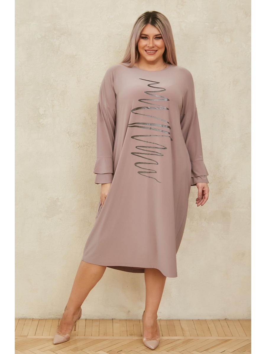 Нарядное платье О – образного силуэта длиной за линию колен. Модель выполнена из пластичного трикотажа «масло». По переду крупная стильная аппликация. Круглый вырез горловины обработан окантовкой. Спинка с центральным швом. Рукава втачные длинные, по низу оформлены двойным воланом. В боковых швах удобные карманы. Низ ровный. Платье поможет создать интересный вечерний образ.