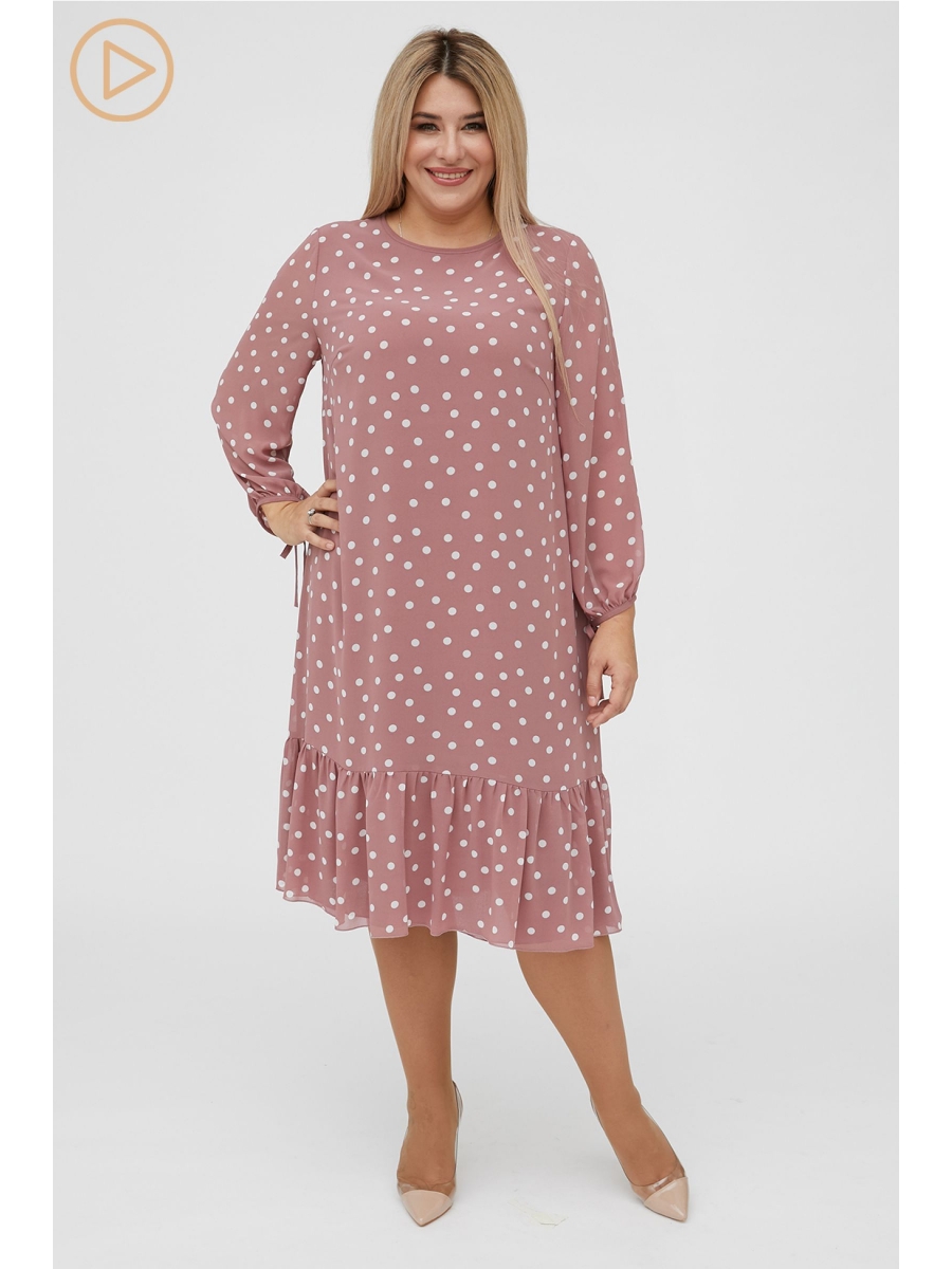 Женственное платье, длиной ниже колен. Модель свободного силуэта, выполнена из однотонного креп шифона, основа на трикотажной подкладке. Прилегание по груди за счет вытачек. Круглый вырез горловины обработан окантовкой. Спинка с центральным швом, оканчивающимся застежкой на петлю и пуговицу. Рукав втачной 7/8, по низу присборен на окантовку и дополнен завязками. Перед и спинка по низу оформлены широкой оборкой. Низ изделия обработан ролевым швом.