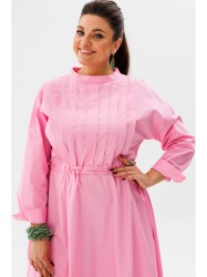 Свободное платье А-силуэта с расклешённым низом очарует вас своей легкостью и изяществом. Параллельные складки на передней части добавляют изысканности, а удлинённая линия плеча и мягкая форма создают романтичный образ. Рубашечные рукава на притачной манжете с застёжкой на петлю и пуговицу добавляют классический штрих.