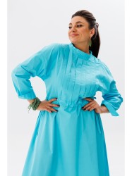 Свободное платье А-силуэта с расклешённым низом очарует вас своей легкостью и изяществом. Параллельные складки на передней части добавляют изысканности, а удлинённая линия плеча и мягкая форма создают романтичный образ. Рубашечные рукава на притачной манжете с застёжкой на петлю и пуговицу добавляют классический штрих.