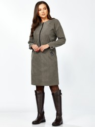 Платье полуприлегающего силуэта из мягкой, комфортной штруксовой ткани. Рукав спущенный, длинный, на манжете с застёжкой на 1 петлю и 1 пуговицу, разрезом. Горловина круглая, застёжка на тесьму-молнию контрастного цвета до талии. По талии подрез, по бокам спереди вставлена резинка, верхняя часть платья имитирует бомбер. Карманы - наклонные листочки, расположены на уровне бёдер по переднему полотнищу юбки, на левой листочке настрочена нашивка контрастного цвета. Перед платья с декоративными подрезами и отстрочкой. Спинка отрезная по талии, на резинке, со средним швом и разрезом по низу.