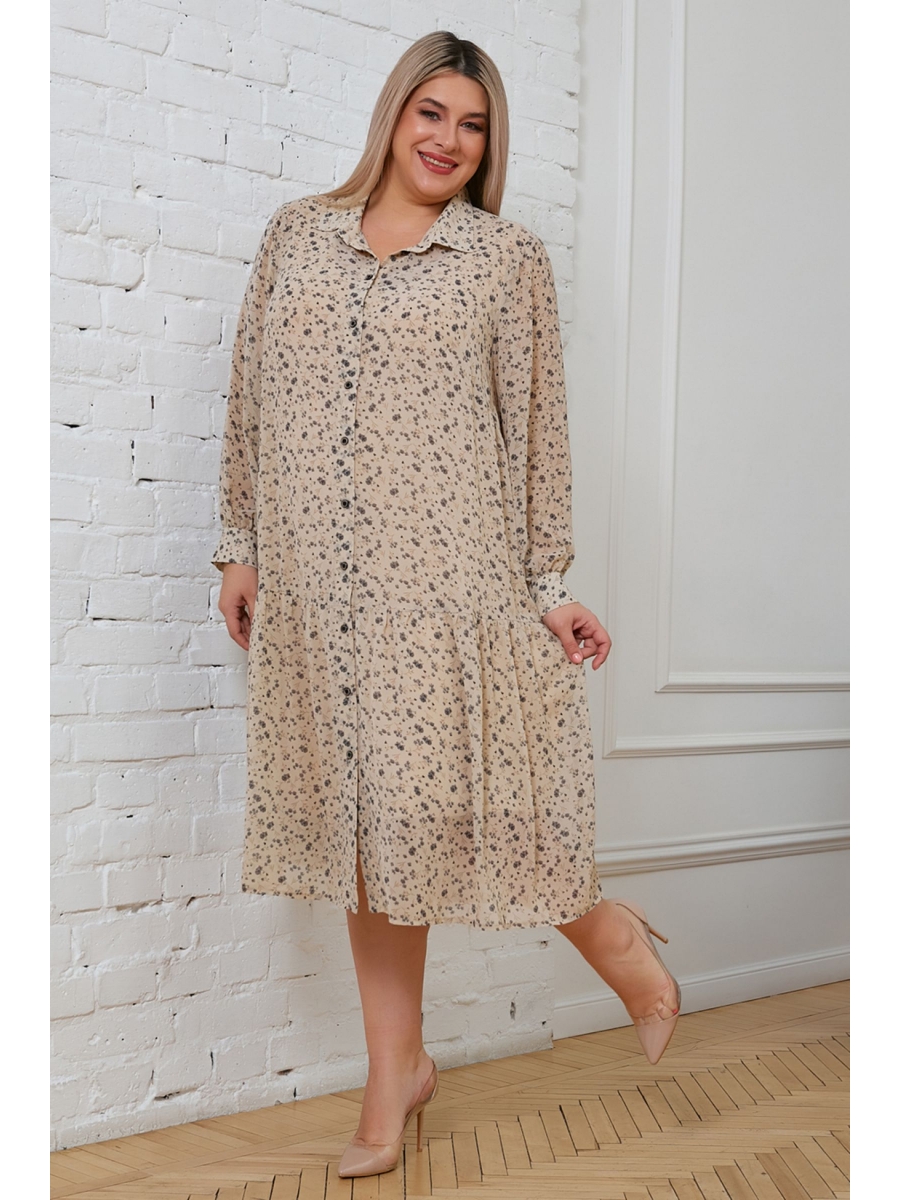 Комфортное платье свободного силуэта из легкого шифона в принт, на подкладке. Горизонтальные подрезы по переду и спинке - дополнены широкой оборкой. Воротник рубашечного типа. По центру переда - застежка на петли и пуговицы. Рукав длинный втачной, присобран по низу на манжету с застежкой на петлю и пуговицу. Низ расклешен, ровный без разрезов. Платье поможет создать легкий повседневный образ, отличный выбор для комфортных летних прогулок.