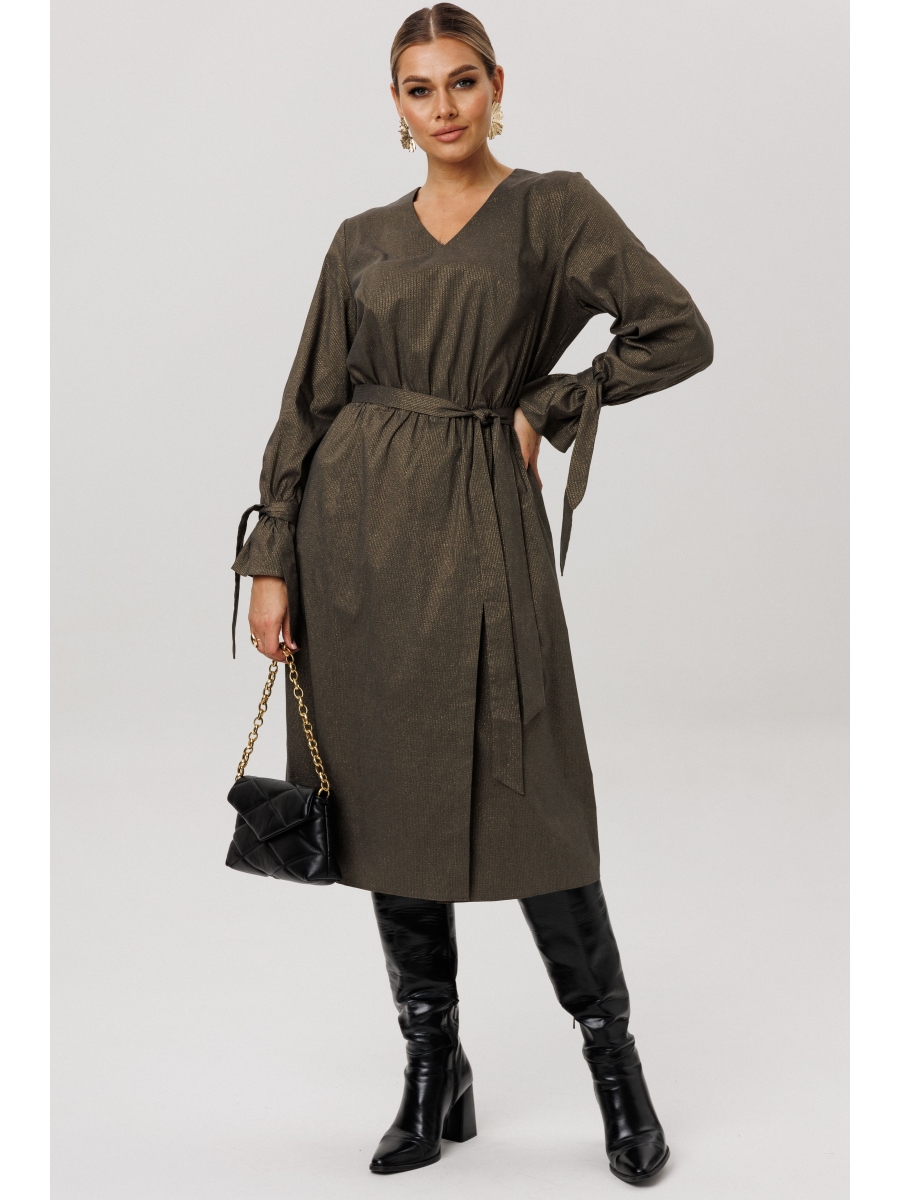 Платье полуприлегающего силуэта миди-длины от Анелли в актуальном темно-зеленом цвете с вкраплениями золотых нитей станет главным элементом вашего гардероба.