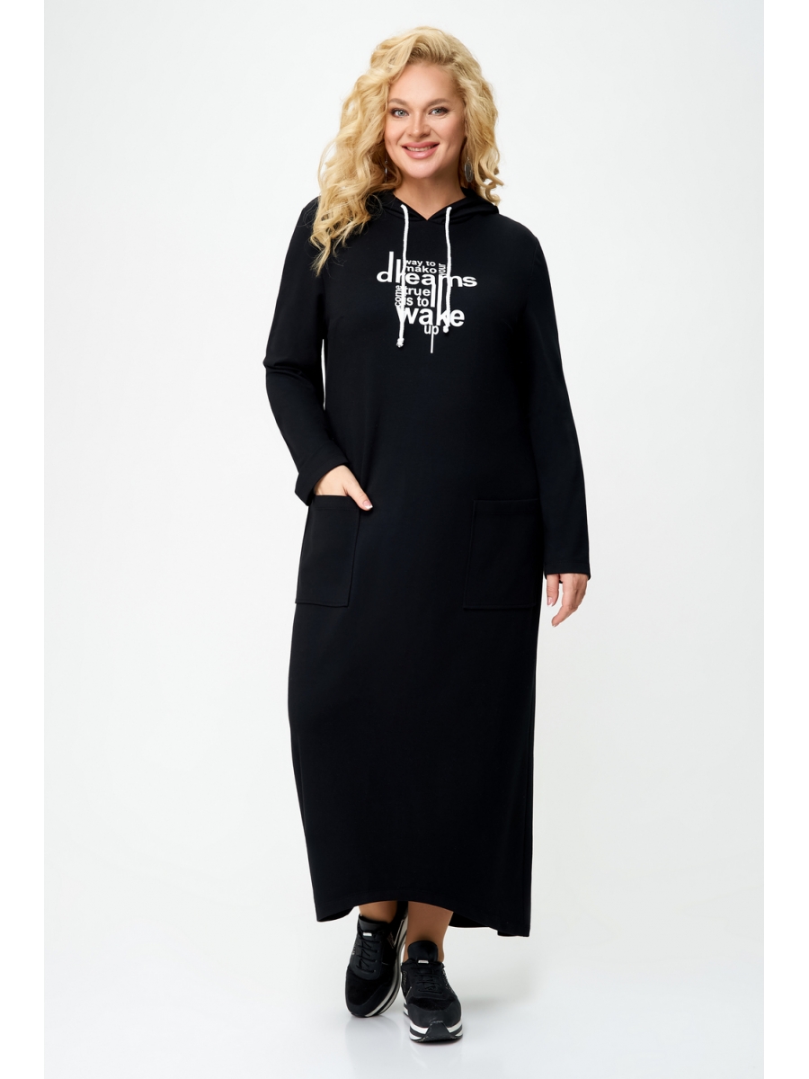 Платье женское прямого силуэта с втачным рукавом. Линия плеча слегка приспущена. По горловине капюшон на кулисе. По переду накладные карманы. По линии груди вытачки. Верхняя часть переда и спинки с термоаппликацией. Низ платья фигурный.