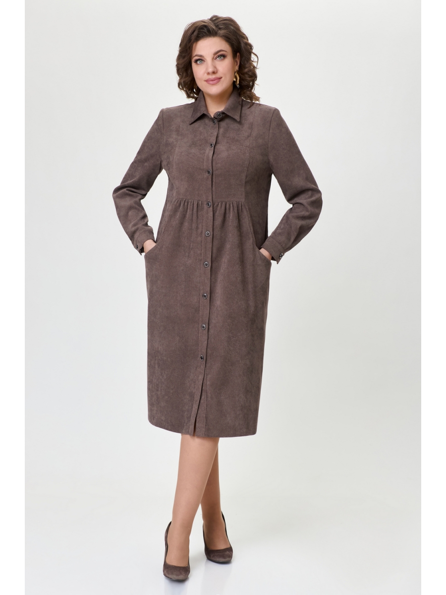 Платье женское полуприлегающего силуэта с втачным рукавом. Застежка на пуговицы на притачных планках. По горловине отложной воротник на отрезной стойке. По переду рельефы от проймы с боковыми карманами. Средняя часть переда со сборкой по линии талии. По спинке средний шов. Рукав длинный, по низу притачная манжета с застежкой на пуговицу.
