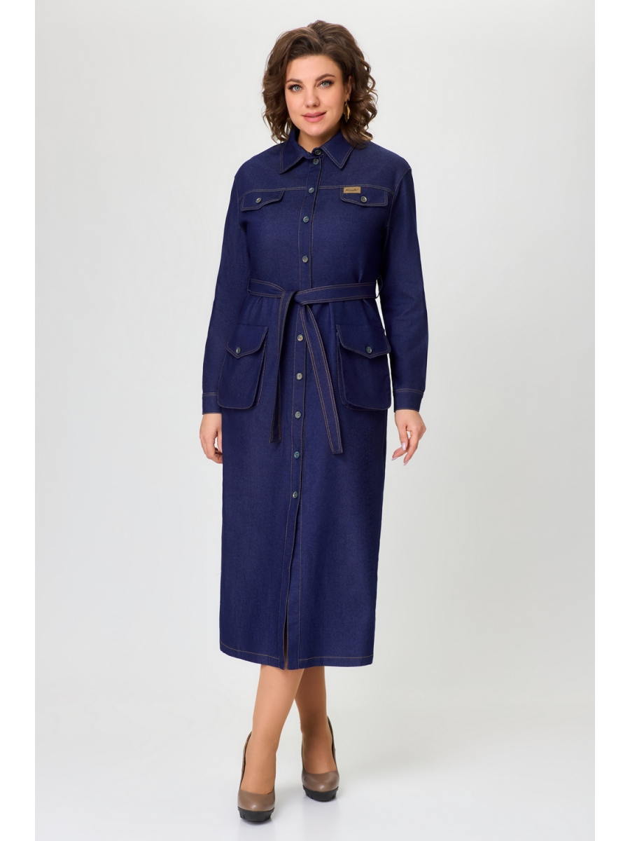 По переду центральная планка с застежкой на петли и пуговицы. По горловине отложной воротник на стойке. По переду в верхней части кокетка и декоративные клапаны в нижней части выполнены объемные накладные карманы с клапаном. По спинке кокетка, и складка из-под кокетки. Рукав втачной со спущенной линией плеча, но низу с притачной манжетой. По талии платье фиксируется съемным поясом.