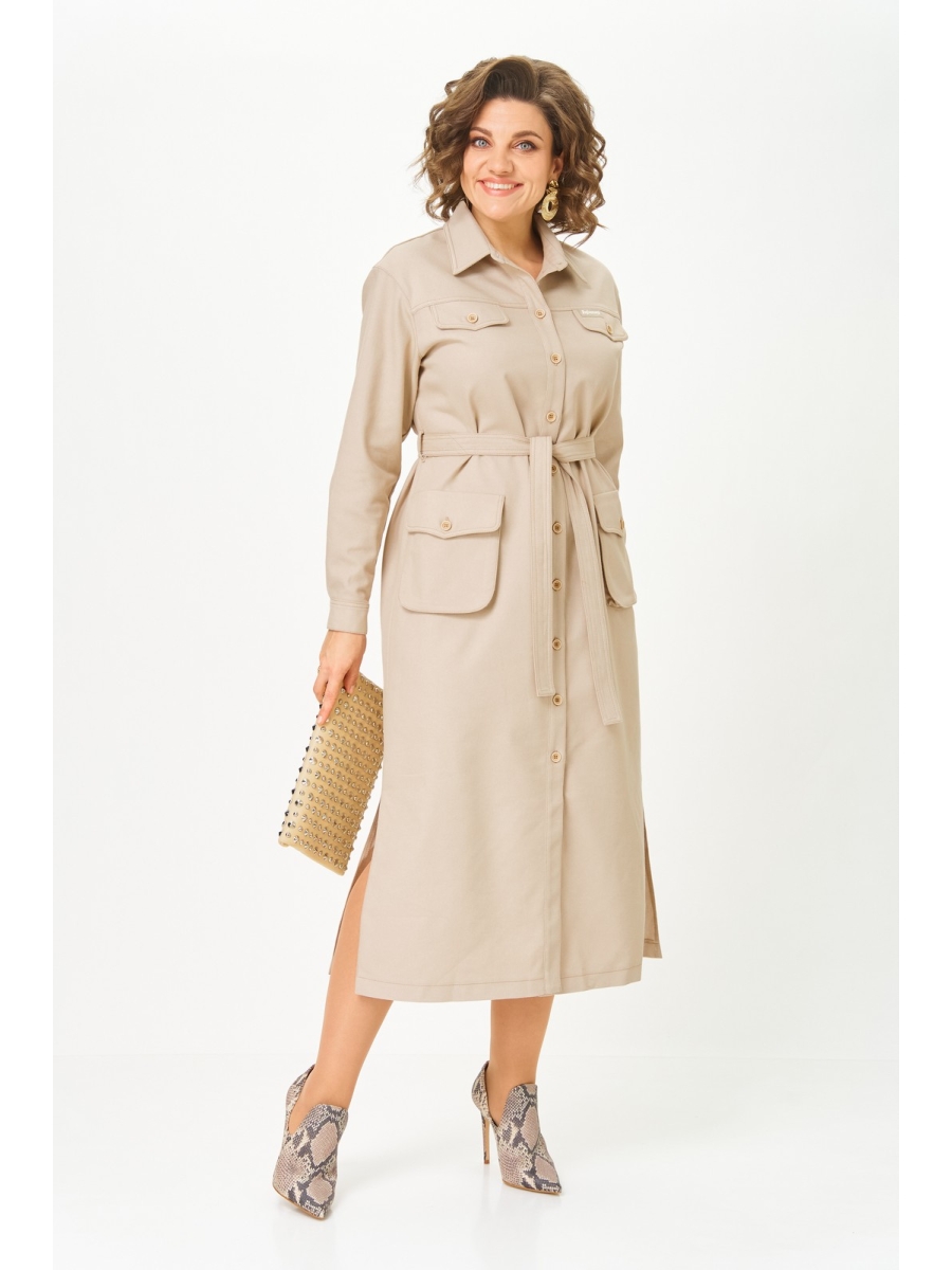 По переду центральная планка с застежкой на петли и пуговицы. По горловине отложной воротник на стойке. По переду в верхней части кокетка и декоративные клапаны в нижней части выполнены объемные накладные карманы с клапаном. По спинке кокетка, и складка из-под кокетки. Рукав втачной со спущенной линией плеча, но низу с притачной манжетой. По талии платье фиксируется съемным поясом.