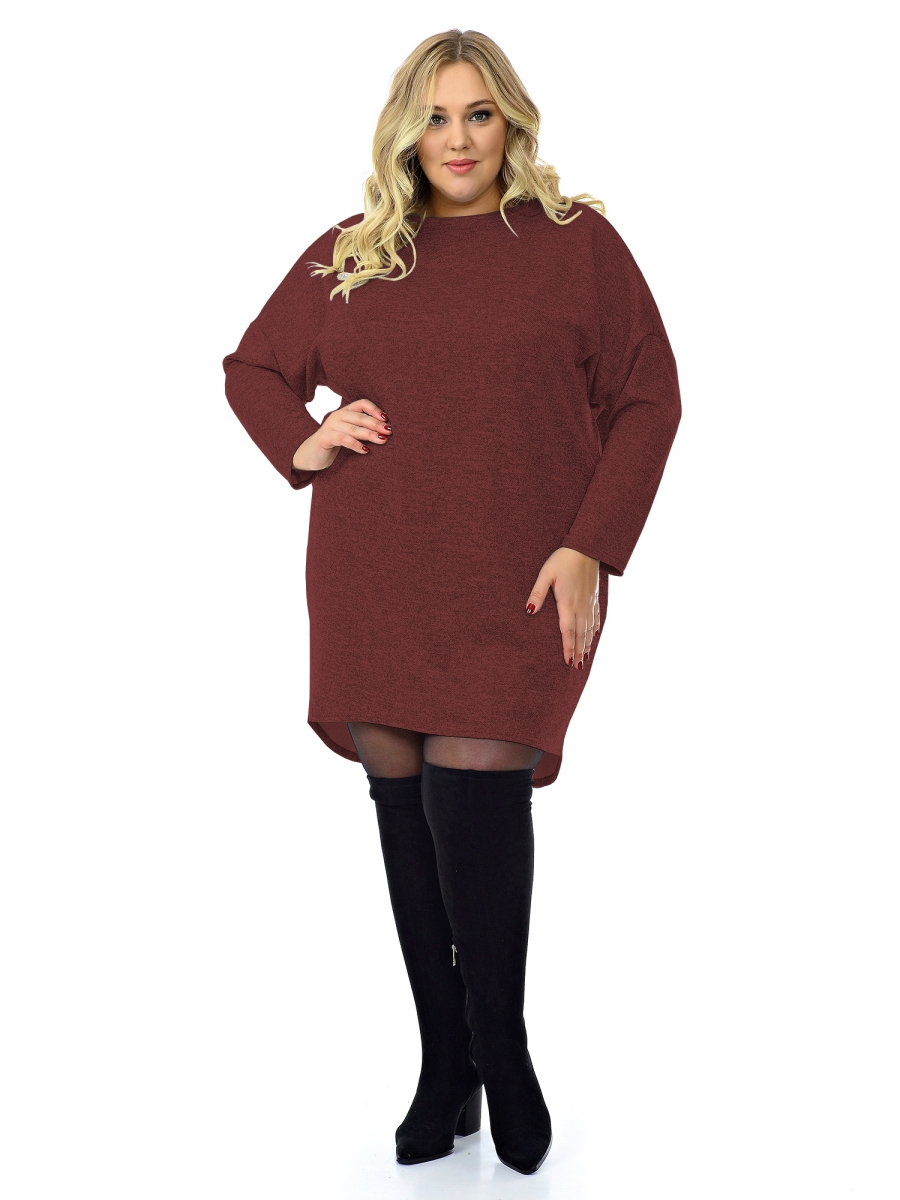 Короткое платье - туника из меланжевого джерси силуэта "кокон". Рукав на основе цельнокроеного. Вырез горловины округлый. Линия низа плавно переходит со спинки на переднюю часть, составляя разницу 8 см.
