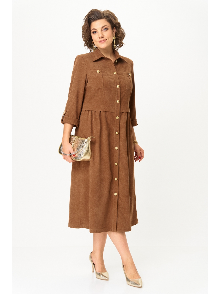 Платье женское полуприлегающего силуэта с втачным рукавом. Застежка на пуговицы на притачных планках. По горловине отложной воротник на отрезной стойке. Верх платья с завышенной талией. По переду накладные карманы. Низ платья – длинная свободная юбка со сборкой из-под верхней части платья и карманами в боковых швах. Рукав длиной 3/4 с отложной манжетой и патой на пуговице.