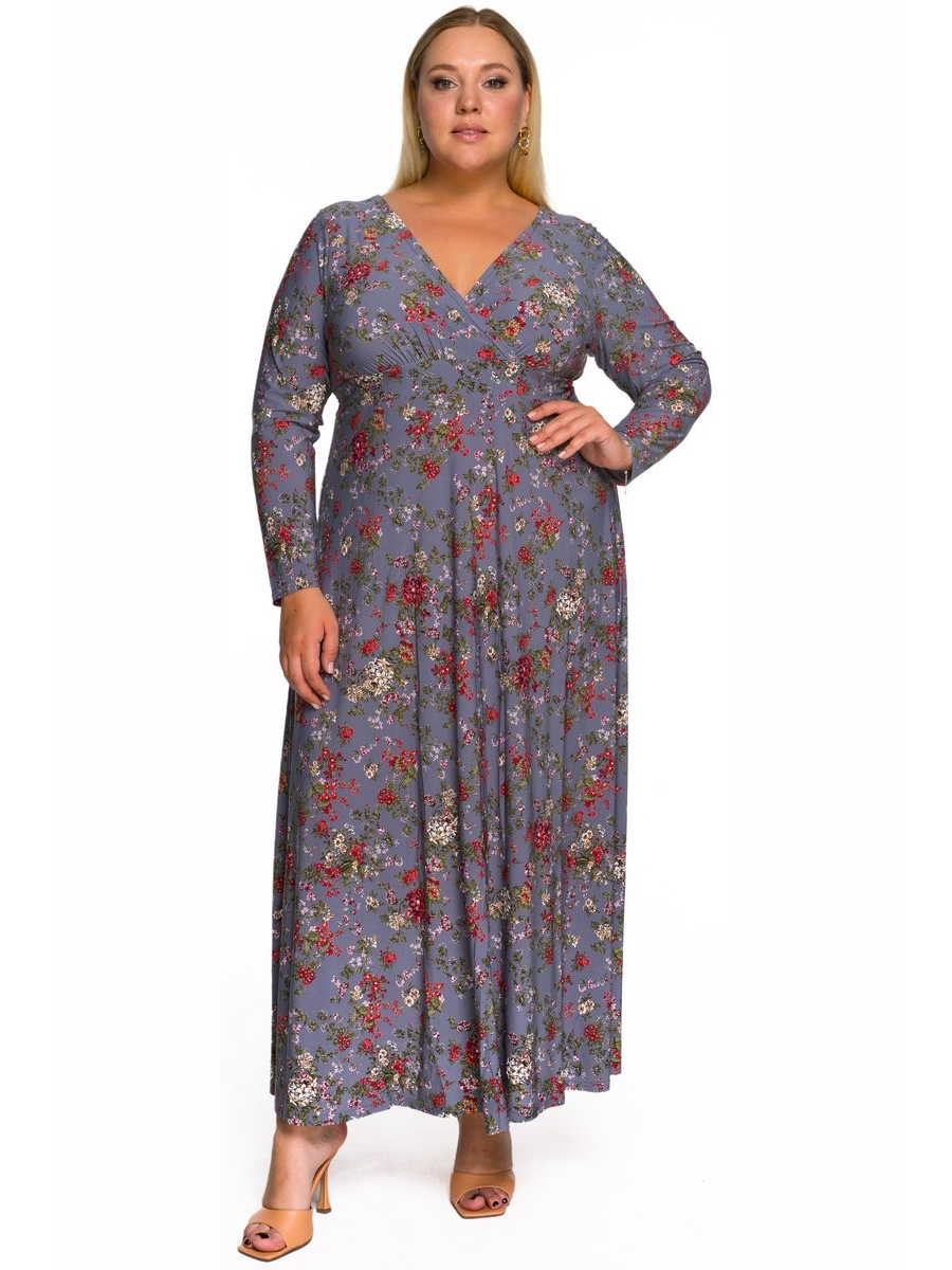 Длинное платье из трикотажа с эластаном. Верхняя часть платья отрезная, с запахом и V-вырезом. Рукав длинный. Талия фиксируется поясками на спинке, втачанными в боковые швы.