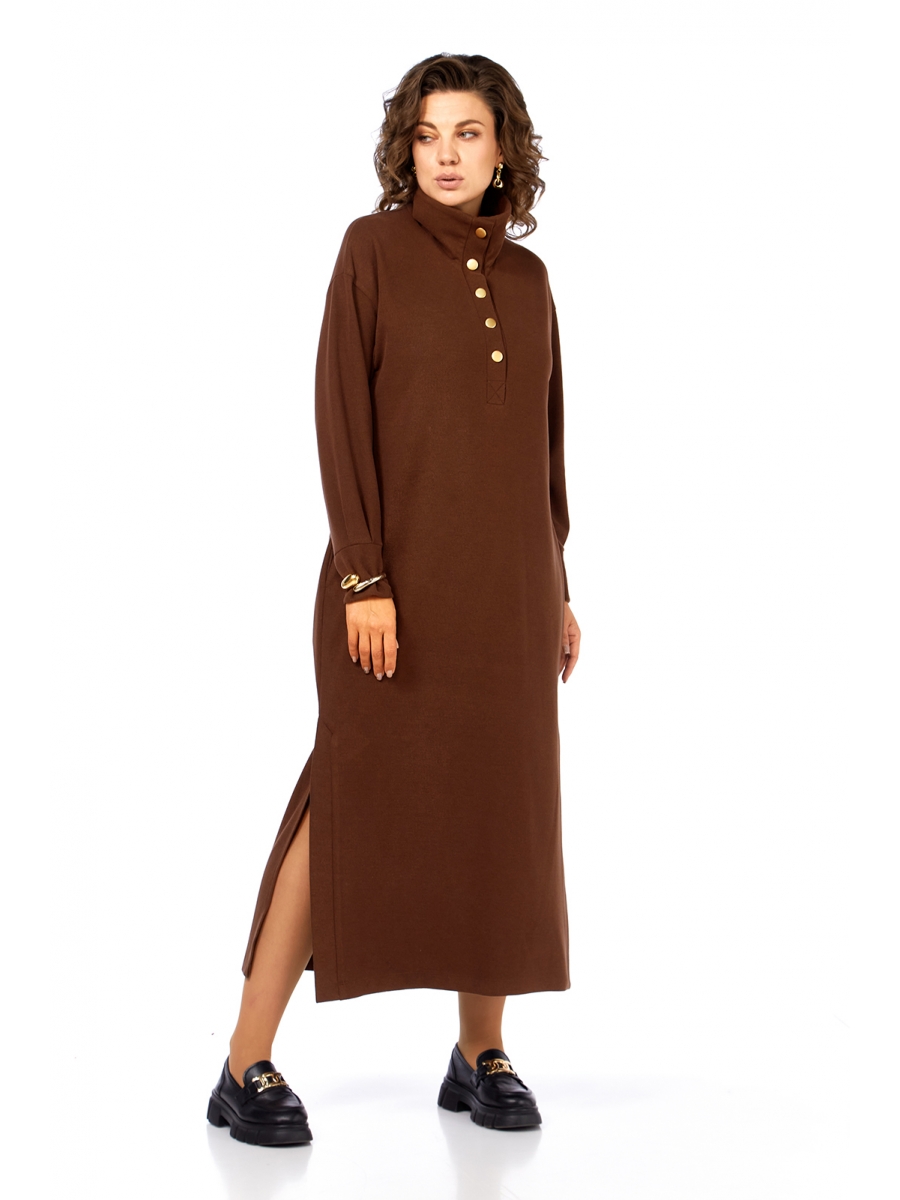 Платье женское прямого силуэта, выполнено из трикотажного полотна. Горловина обработана воротником стойкой, застежка планка на петли и пуговицы. В боковых швах обработаны карманы, по низу шлицы. Рукава спущенные, длинные внизу на манжетах.