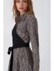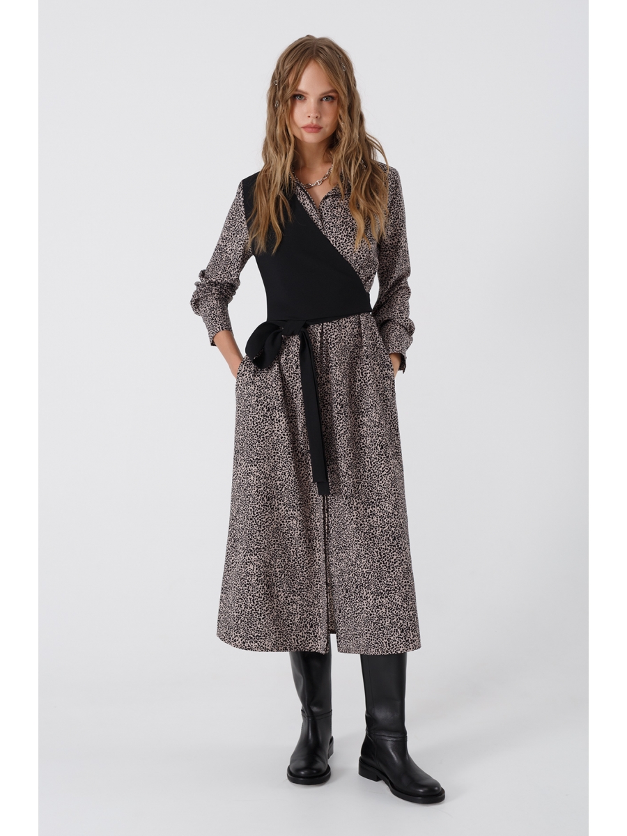 Асимметричное платье-рубашка из текстильной ткани с дизайном. Детали: трапециевидный силуэт, нагрудные вытачки, рубашечный воротник, потайная застежка-планка на петли и пуговицы, рукава втачные длинные на манжетах, боковые карманы. Платье с отлетной кокеткой, имитирующую жилет и поясами, при помощи которых можно регулировать прилегание.
