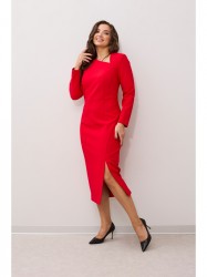 Платье полуприлегающего силуэта. По переду отрезное по линии талии с рельефами, с асимметричной фигурной горловиной. По низу переда фигурный подрез, заканчивающийся разрезом по левой стороне переда. По спинке средний шов с застежкой на молнию и талиевые вытачки. Рукав втачной, зауженный книзу.