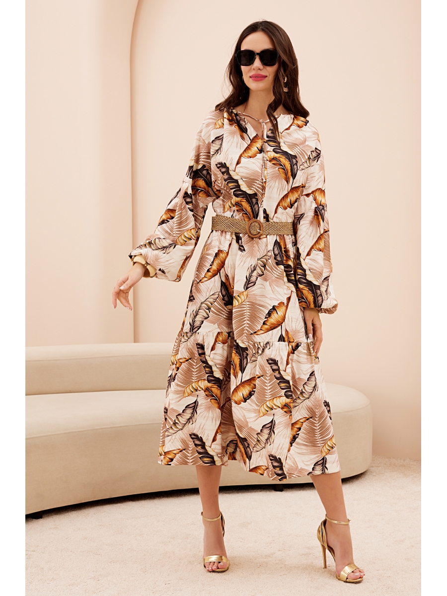 Эффектное платье в стиле «Бохо» из очень приятной принтованной ткани дополнено готовым поясом, отлично подходит для шпилек и обуви на плоском ходу. Платье А образного силуэта с притачным воланом отрезное по линии талии (на резинке). Лиф со средним швом и округлым вырезом на завязках с фиксаторами, Рукав комбинированного покроя, линия плеча приспущена, нижняя часть со складками и резинкой по низу (можно регулировать длину рукава). Съемный пояс фабричного производства завершает весь образ.