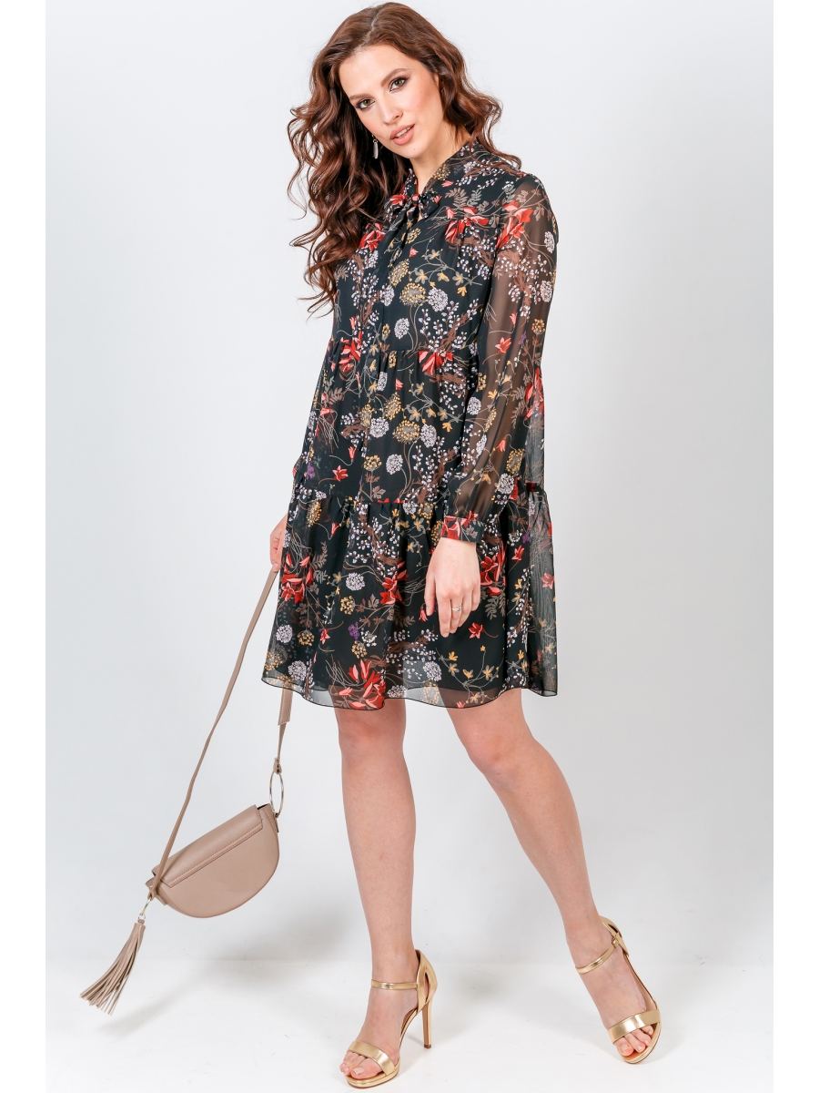 Платье трапециевидного силуэта, отрезное выше линии талии. Нижняя часть переда и спинки из двух воланов, собраных в сборку.Верхняя часть переда с кокеткой. Горловина v образная с притачным воротником- галстуком, завязывающимся на бант. Рукав втачной, длинный, по низу на притачной манженте, застегивающейся на петлю и пуговицу.Платье на подкладке.