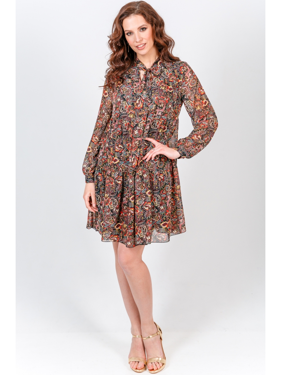 Платье трапециевидного силуэта, отрезное выше линии талии. Нижняя часть переда и спинки из двух воланов, собраных в сборку.Верхняя часть переда с кокеткой. Горловина v образная с притачным воротником- галстуком, завязывающимся на бант. Рукав втачной, длинный, по низу на притачной манженте, застегивающейся на петлю и пуговицу.Платье на подкладке.