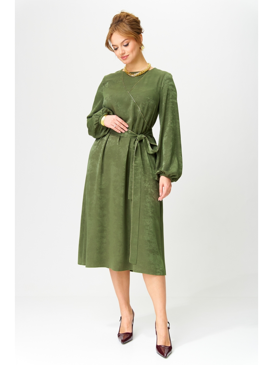 Платье А-образного силуэта из плательной ткани с эффетом замши. Перед с подрезами формирующими треугольник и нагрудными вытачками. В подрезы и пояс вставлен декоративный кант. Рукав одношовный втачной по низу собранный на резинку.