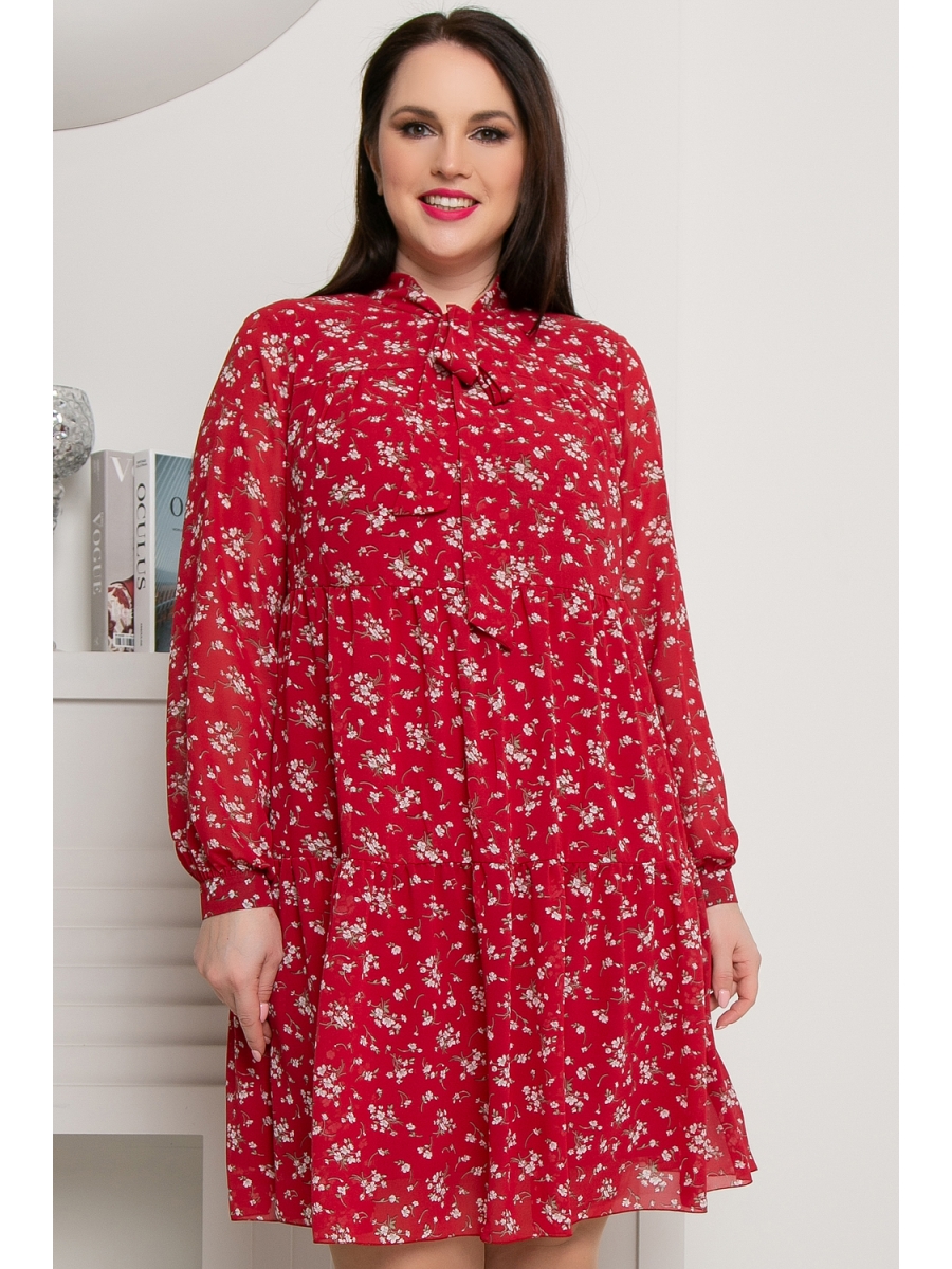 Платье трапециевидного силуэта, отрезное выше линии талии. Нижняя часть переда и спинки из двух воланов, собраных в сборку.Верхняя часть переда с кокеткой. Горловина v образная с притачным воротником- галстуком, завязывающимся на бант. Рукав втачной, длинный, по низу на притачной манженте, застегивающейся на петлю и пуговицу.Платье на подкладке.