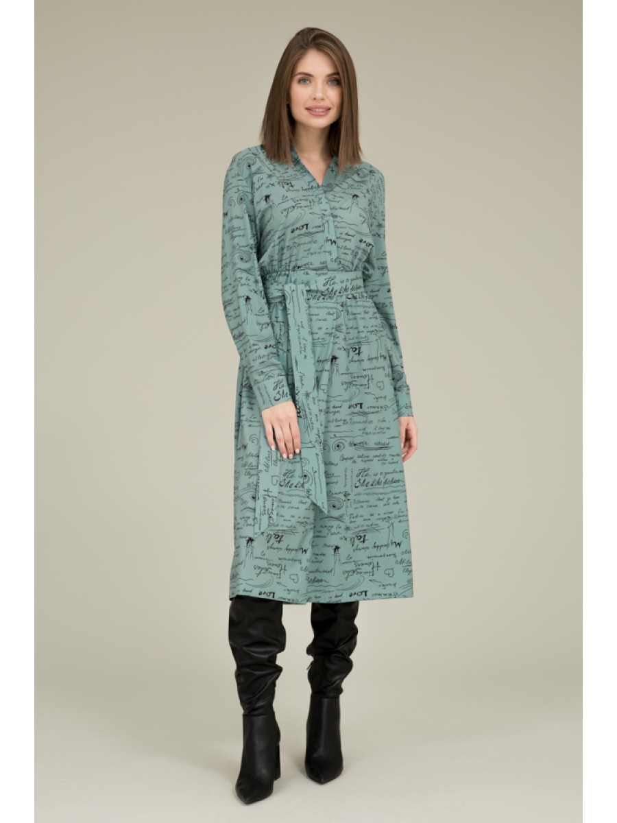 Платье свободного силуэта из плательной ткани. Изделие отрезное по линии талии с резинкой. Лиф платья с запахом, фиксируется на пуговицу для удобства. На передней части юбки выполнена складка, имитирующая запах, в боковых швах карманы. Линия горловины оформлена воротником-стойкой. Втачной длинный рукав с манжетой, застегивающейся на пуговицы. В комплекте пояс из основной ткани.