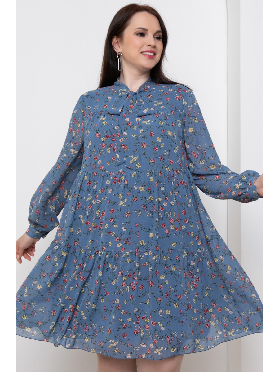 Платье женское трапециевидного силуэта, отрезное выше линии талии. Нижняя часть переда и спинки из двух воланов, собраных в сборку.Верхняя часть переда с кокеткой. Горловина v образная с притачным воротником- галстуком, завязывающимся на бант. Рукав втачной, длинный, по низу на притачной манженте, застегивающейся на петлю и пуговицу.Платье на подкладке. Ткань верха - шифон.
