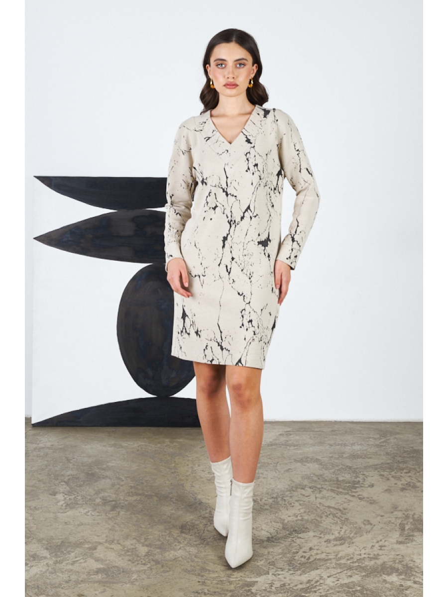 Платье свободного силуэта из фактурного эластичного полотна. V-образный вырез горловины обработан притачной планкой. Втачной длинный рукав в спущенную пройму с манжетой.