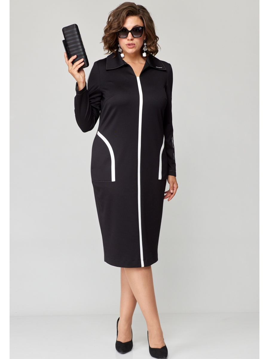 Платье женское нарядно-повседневное прилегающего силуэта, выполнено из трикотажного полотна в сочетании с отделкой. Вырез горловины отложной воротник. По центру переда втачная планка из отделочной ткани, нагрудные выточки и накладные карманы. Рукав втачной, по центру с отделкой.спинка с центральным швом и небольшим разрезом обработанным отделочной тканью. Декором служат детали из отделочной ткани и нашивка на воротнике.