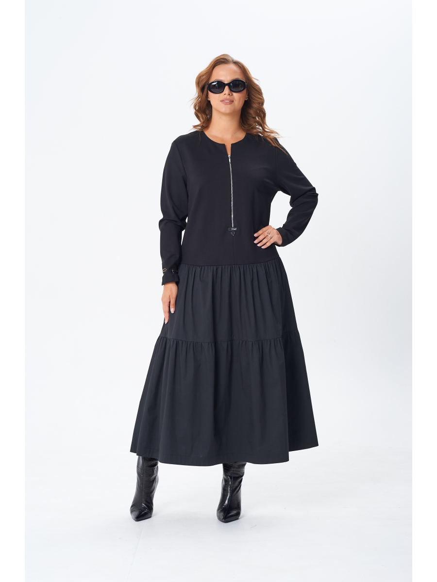 Оформить заказ →Платье женское в стиле бохо выполнено из двух материалов: лиф-трикотажный, низ платья из однотонной хлопковой ткани. По переду лифа платья центральная застежка на молнию, нагрудные вытачки из бокового шва. По спинке средний шов. Горловина округлой формы обработана обтачкой. Рукав втачной длинный. Нижняя часть платья из двух присобранных воланов, в боковых швах функциональные карманы.