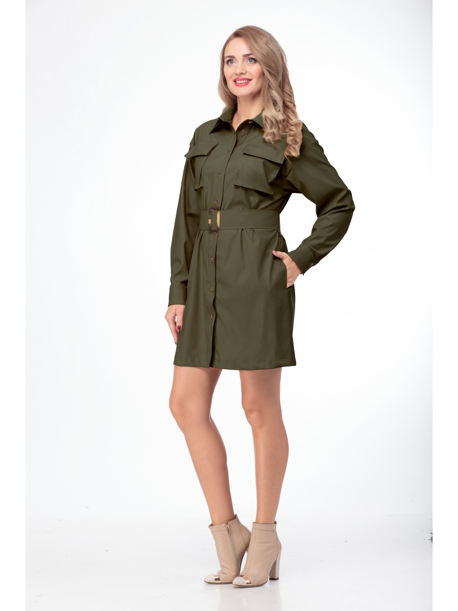 Платье-рубашка из эко-кожи свободного покроя с накладными карманами-книга и клапаном. Спущенная линия плеча, втачной одношовный рукав на манжете. Застежка на пуговицы по притачной планке. Отложной воротник на стойке.