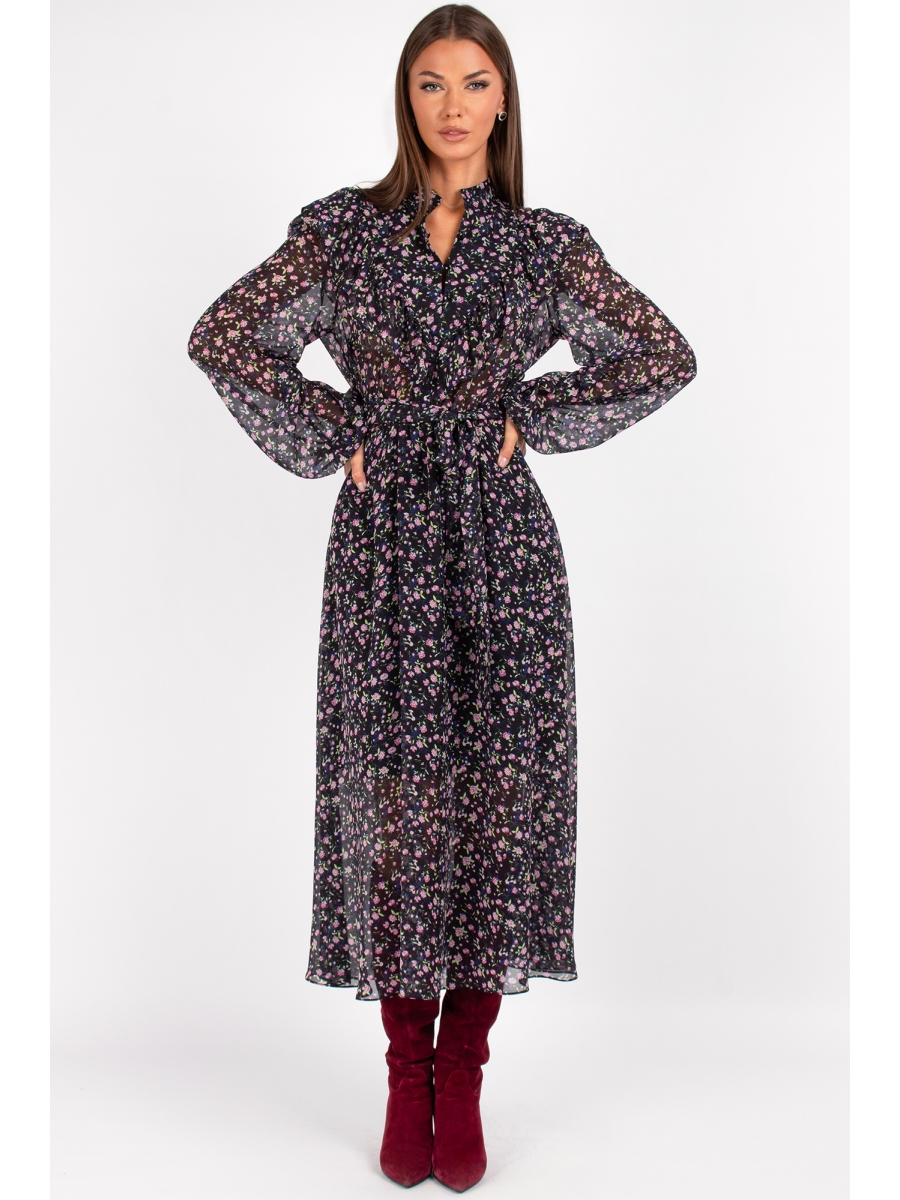 Передняя часть платья с нагрудными вытачками, швом посередине, с кокеткой и вставленной в нее рюшей. Перед с застежкой на 3 навесные петли и пуговицы. Спинка с рельефом. В рельефы вставлена рюша, переходящая с переда. Юбка платья - полусолнце на подкладке. Рукав втачной одношовный со сборкой у оката. Низ рукава на резинке. Воротник - стойка. По талии завязывающейся пояс.