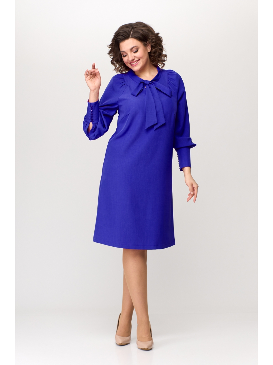 Платье «А» образного силуэта с круглой горловиной оформленной стойкой, украшением служит съемный бант. Платье с фигурной проймой, рукав расширенный, со стойкой по окату и низу. Низ рукава оформлен широким манжетом с декоративными пуговицами. Платье без подкладки.