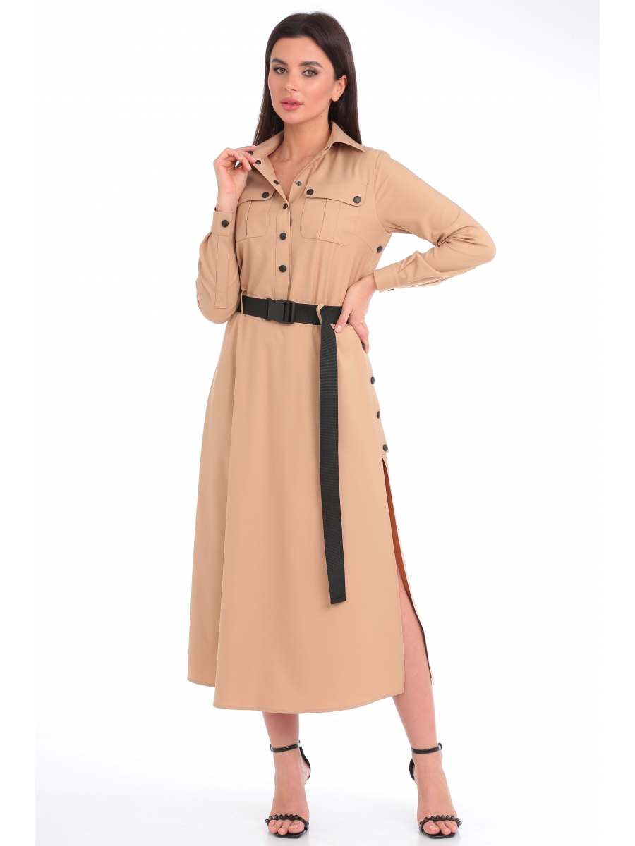 Лаконичное женское платье выручит свою обладательницу в любой ситуации. Благодаря своей универсальности платье отлично подойдет для любого мероприятия или повода: на деловой или дружеской встрече, в офисе или кафе. Платье полуприлегающего силуэта, расклешенное книзу. Воротник рубашечного типа на притачной стойке. Платье отрезное по линии талии, со шлевками для пояса. Полочка с центральной застежкой на притачных планках на контрастные кнопки, нагрудными вытачками и накладными карманами со складкой и клапаном. В боковых швах юбки планки с застежкой на контрастные кнопки и разрезы. Рукав втачной длинный, понизу с притачной манжетой с застежкой на кнопку.