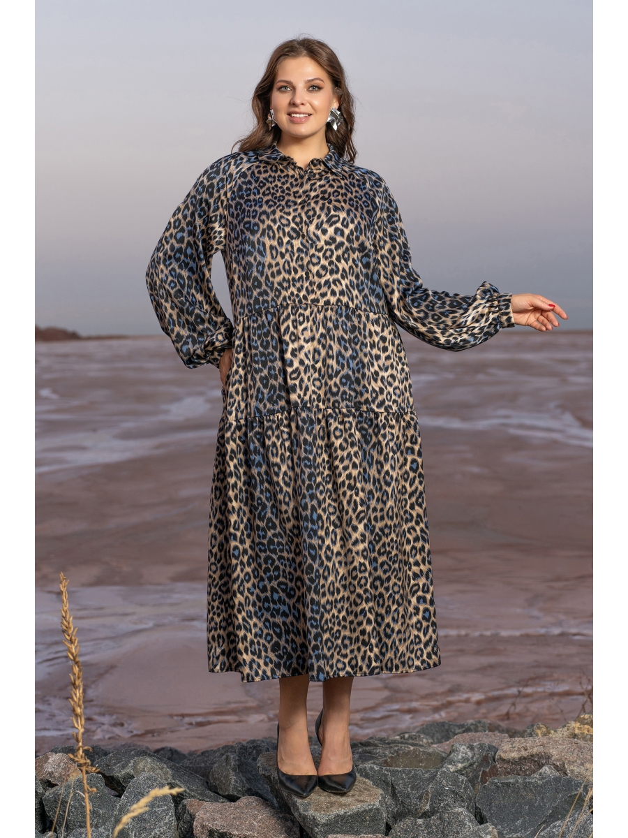 Платье силуэта транеция в стиле "бохо", воротник со стойкой, лиф застёгивается на петли пуговицы. Платье с притачными двумя воланами, с боковыми карманами. Рукава со сборкой по низу, с притачной манжетой застёгивающейся на петлю и пуговицу.