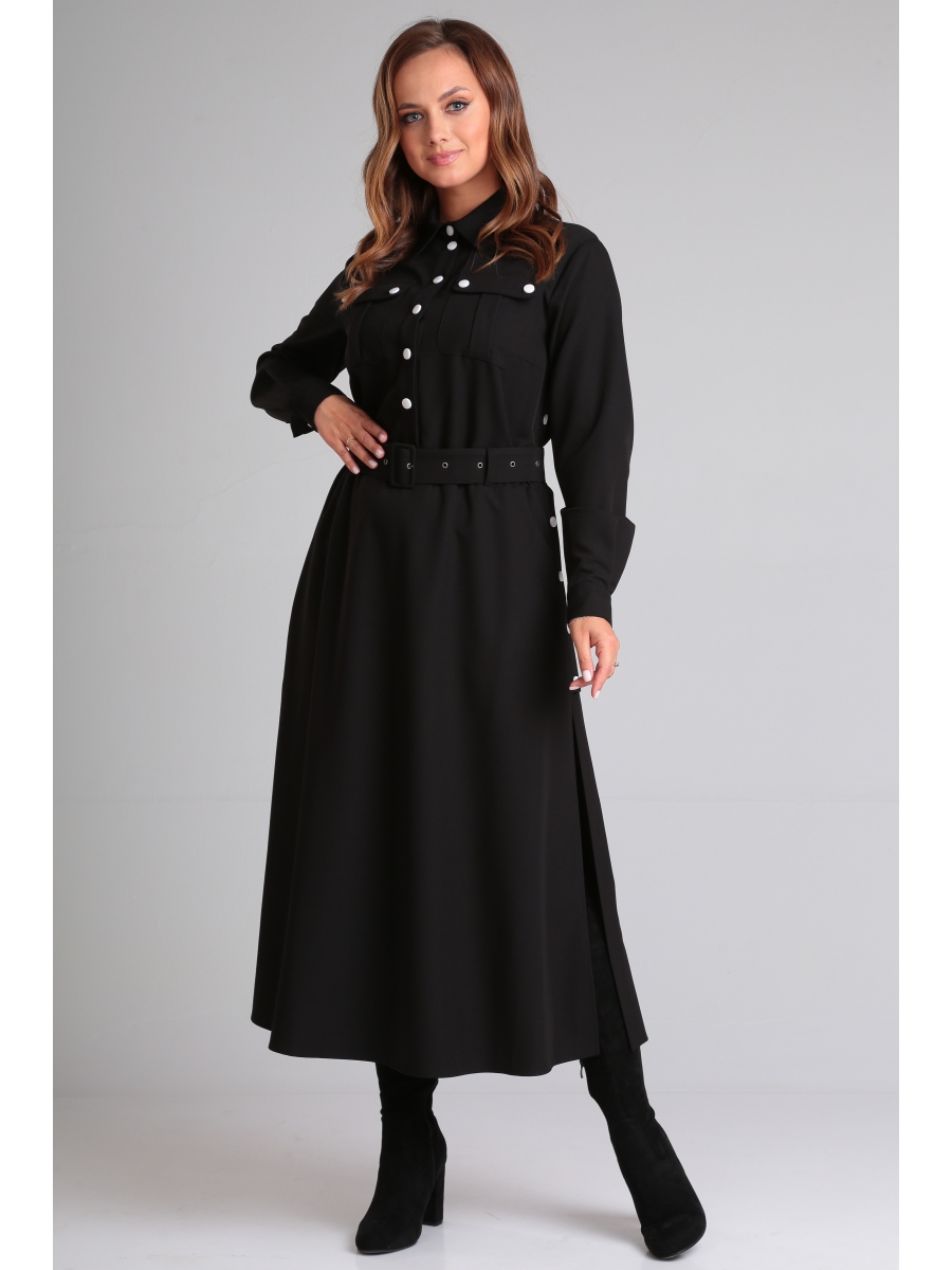 Лаконичное женское платье выручит свою обладательницу в любой ситуации. Благодаря своей универсальности платье отлично подойдет для любого мероприятия или повода: на деловой или дружеской встрече, в офисе или кафе. Платье полуприлегающего силуэта, расклешенное книзу. Воротник рубашечного типа на притачной стойке. Платье отрезное по линии талии, со шлевками для пояса. Полочка с центральной застежкой на притачных планках на контрастные кнопки, нагрудными вытачками и накладными карманами со складкой и клапаном. В боковых швах юбки планки с застежкой на контрастные кнопки и разрезы. Рукав втачной длинный, понизу с притачной манжетой с застежкой на кнопку. В комплект входит пояс из основной ткани.