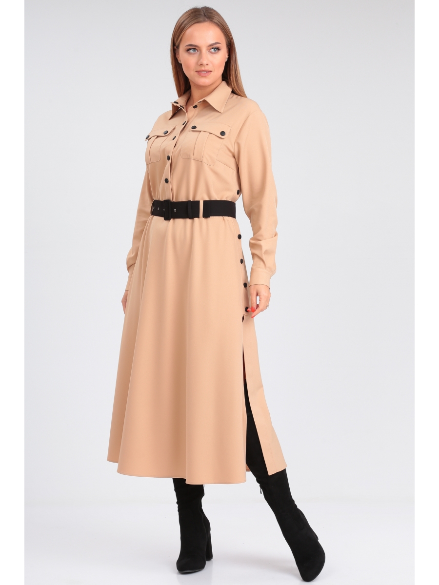 Оформить заказ →Лаконичное женское платье выручит свою обладательницу в любой ситуации. Благодаря своей универсальности платье отлично подойдет для любого мероприятия или повода: на деловой или дружеской встрече, в офисе или кафе. Платье полуприлегающего силуэта, расклешенное книзу. Воротник рубашечного типа на притачной стойке. Платье отрезное по линии талии, со шлевками для пояса. Полочка с центральной застежкой на притачных планках на контрастные кнопки, нагрудными вытачками и накладными карманами со складкой и клапаном. В боковых швах юбки планки с застежкой на контрастные кнопки и разрезы. Рукав втачной длинный, понизу с притачной манжетой с застежкой на кнопку. В комплекте к платью прилагается съемный пояс.